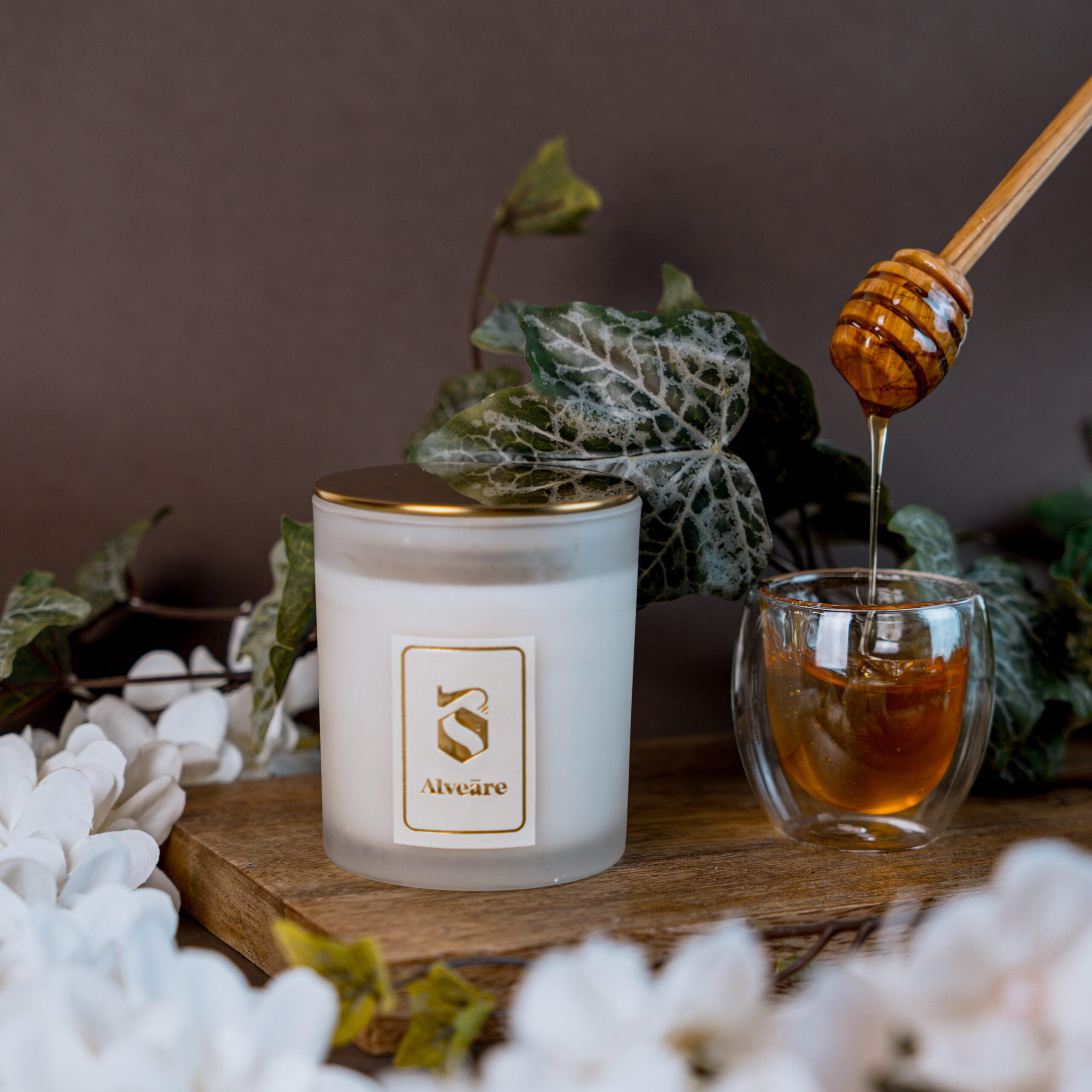 Χειροποίητο αρωματικό κερί σόγιας Enchantment με άρωμα Honey Blossom σε frosted βάζο και μεταλλικό καπάκι. Ιδανικό για μεσαίους χώρους ή γραφεία.